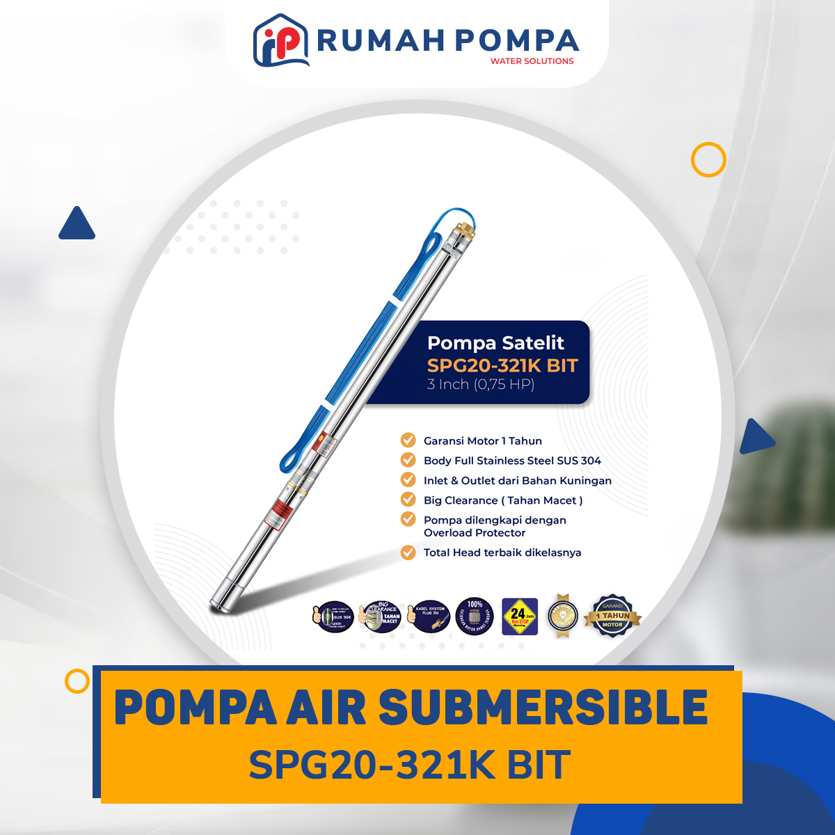 Pompa Submersible SHIMIZUSPG20-321K BIT merupakan pompa satelit 3 inch yang dirancang khusus untuk sumur dalam dengan posisi pompa terendam air guna memenuhi kebutuhan air bersih dan sangat cocok dipakai untuk sumber air rumah tangga serta mempunyai Tenaga Motor 0.75 HP, Daya Output 550 Watt dan Input 920 Watt.