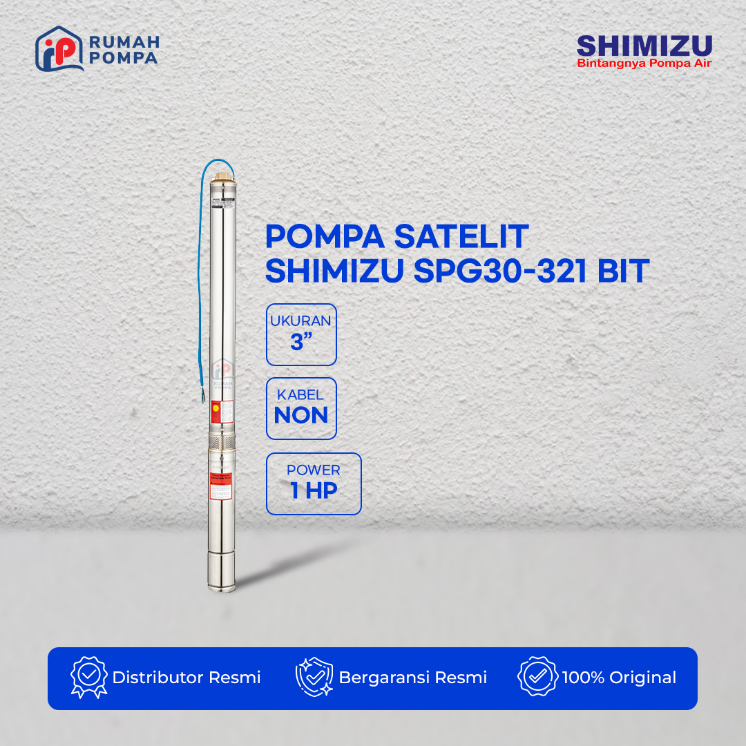 Pompa Submersible SHIMIZUSPG30-321 BIT merupakan pompa satelit 3 inch non kabel yang dirancang khusus untuk sumur dalam dengan posisi pompa terendam air guna memenuhi kebutuhan air bersih dan sangat cocok dipakai untuk sumber air rumah tangga serta mempunyai Tenaga Motor 1 HP, Daya Output 750 Watt dan Input 1.140 Watt.